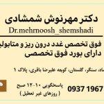 مهرنوش شمشادی، فوق تخصص در شهر کرمانشاه است. مطب مهرنوش شمشادی در چهارراه سنگر، گلستان، کوچه شهید علیرضا باقری، پلاک ۱ واقع شده است که در صورت نیاز میتوانید با شماره 09371967393 تماس بگیرید.