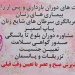 مرکز مشاوره وخدمات مامایی مهر آفرین در خیابان کسری کرمانشاه با ۳۸ سال سابقه کار انجام کلیه خدمات مامایی و مشاوره ای زنان از نوزادی تا یائسگی انجام پاپ اسمیر بیماریهای زنان کارگذاری آی یو دی گواهی سلامت تعیین جنسیت