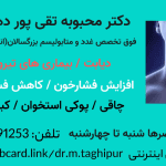زودترین زمان رزرو نوبت از مطب محبوبه تقی پور امروز 17:30 میباشد که میتوانید از طریق وبسایت و یا اپلیکیشن نوبتدهی پذیرش۲۴ نوبت خود را به صورت اینترنتی و غیرحضوری دریافت کنید.